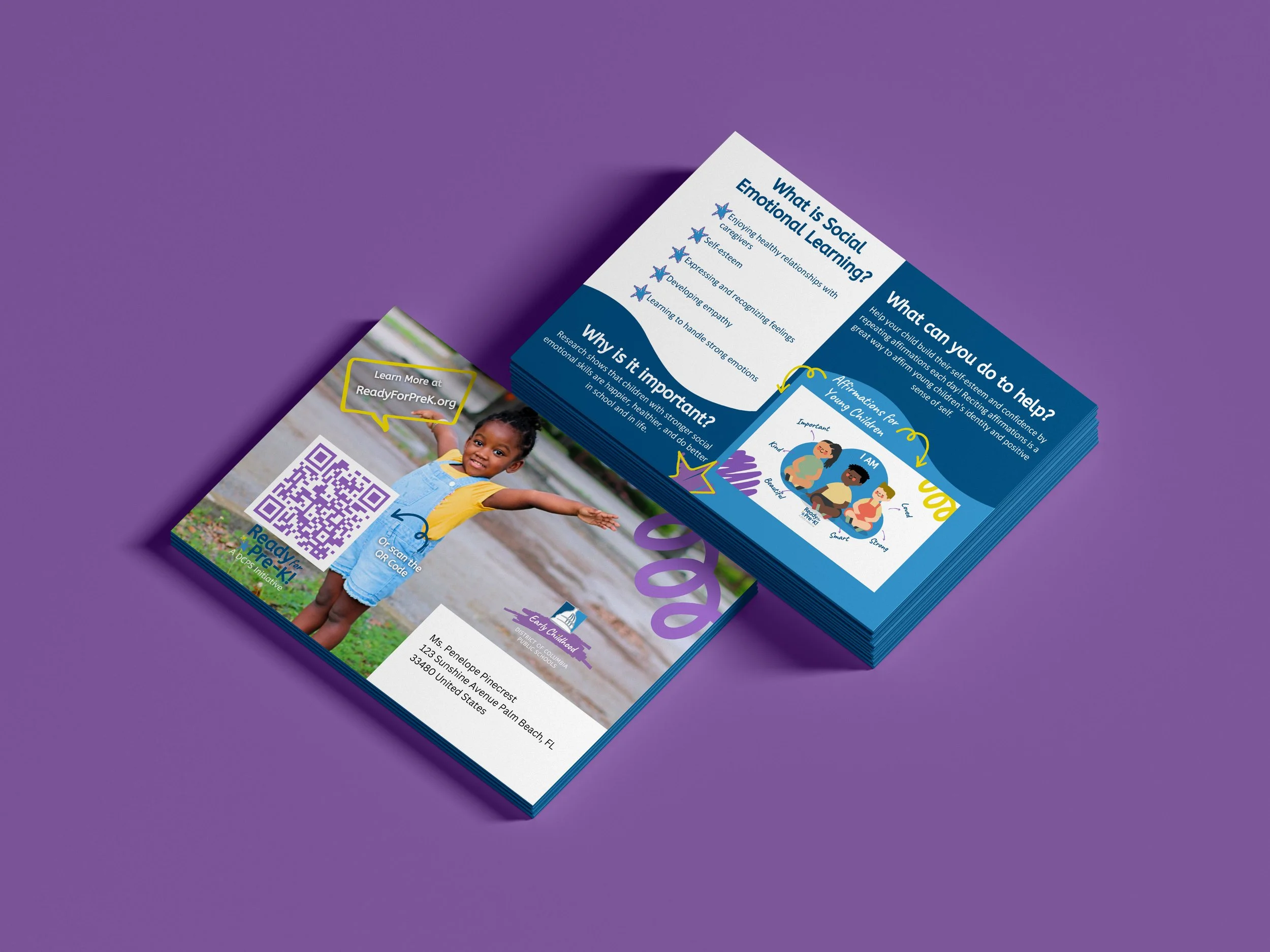 The Postcard Magnets project aims to introduce families to our Ready for Pre-K! and Scribbles programs, guiding them towards RFPK! website for further engagement. Additionally, the project includes a detachable magnet for parents to use with their children, promoting self-confidence and providing comfort during moments of frustration before heading to school or elsewhere.